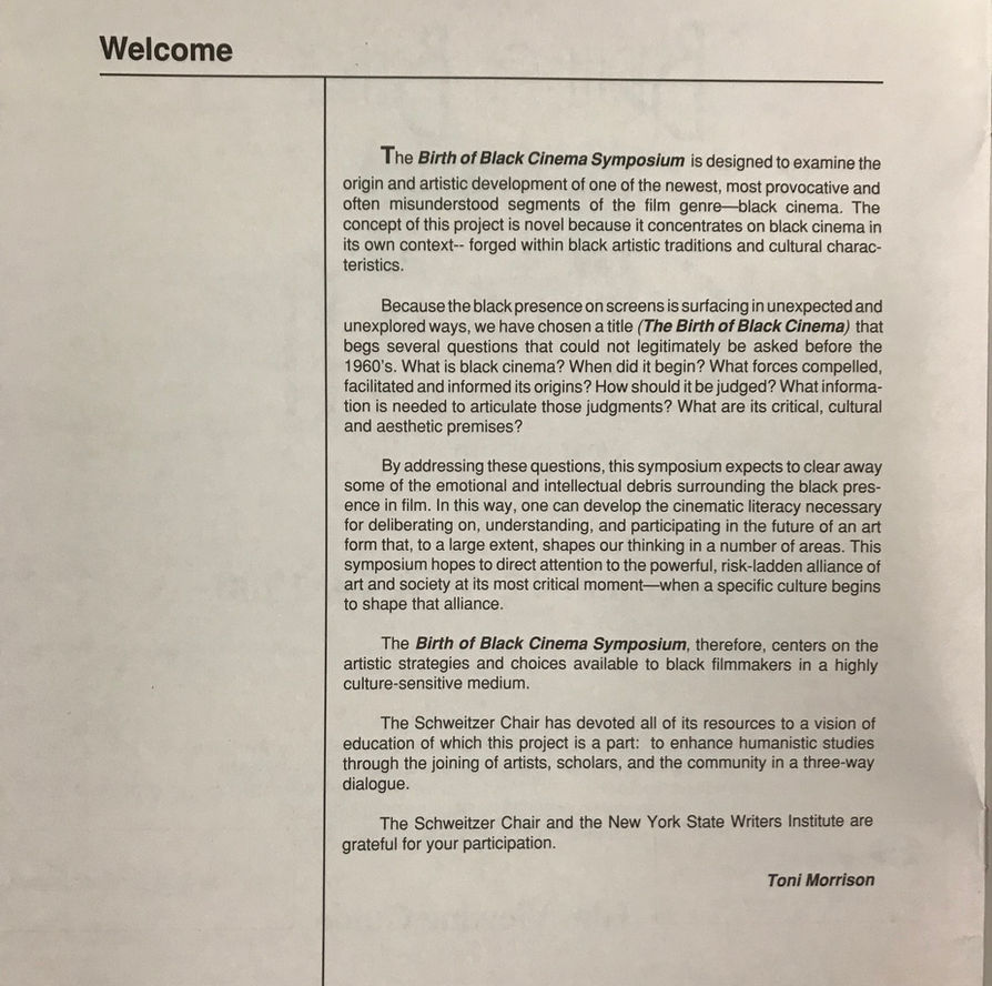 Morrison also produced "The Birth of Black Cinema" three-day symposium in 1988 featuring Spike Lee, Toni Cade Bambara, St. Clair Bourne, Haile Gerima, James Snead and Hortense Spillers.